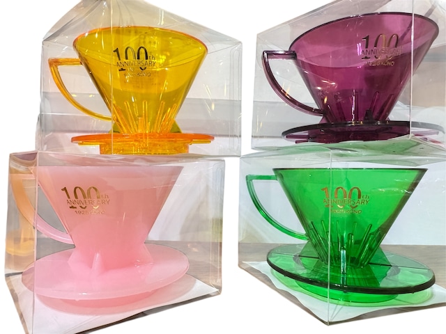 100周年限定バージョン名門2人用フィルター第2弾‼‼ 4色各カラーを40個ずつ予約販売いたします。 このときにしか手に入らないKONOの100周年限定バージョン ぜひコレクションの仲間入りにしてみてはいかかですか? プロが入れたようなおいしいコーヒーが 自宅で入れられるコーノ式(河野式)コーヒーフィルターです。 ドリッパーの形が円すいで、ご使用するペーパーも純正の円すいペーパーをご使用ください。 KONO式ドリッパーの特徴は、ペーパー式ドリップの手軽さで、 ネルドリップに近い香味の珈琲が淹れられるということ。 円すい形のドリッパーは、注いだ湯が中心から周囲へと浸透し 珈琲液は底の部分に集中して落ちていくため、 珈琲豆の味・風味すべてを逃がさず抽出できる構造を持っています。 ※4色すべて箔押は100thロゴ ※来月入荷次第の発送となります。 ご了承くださいませ。