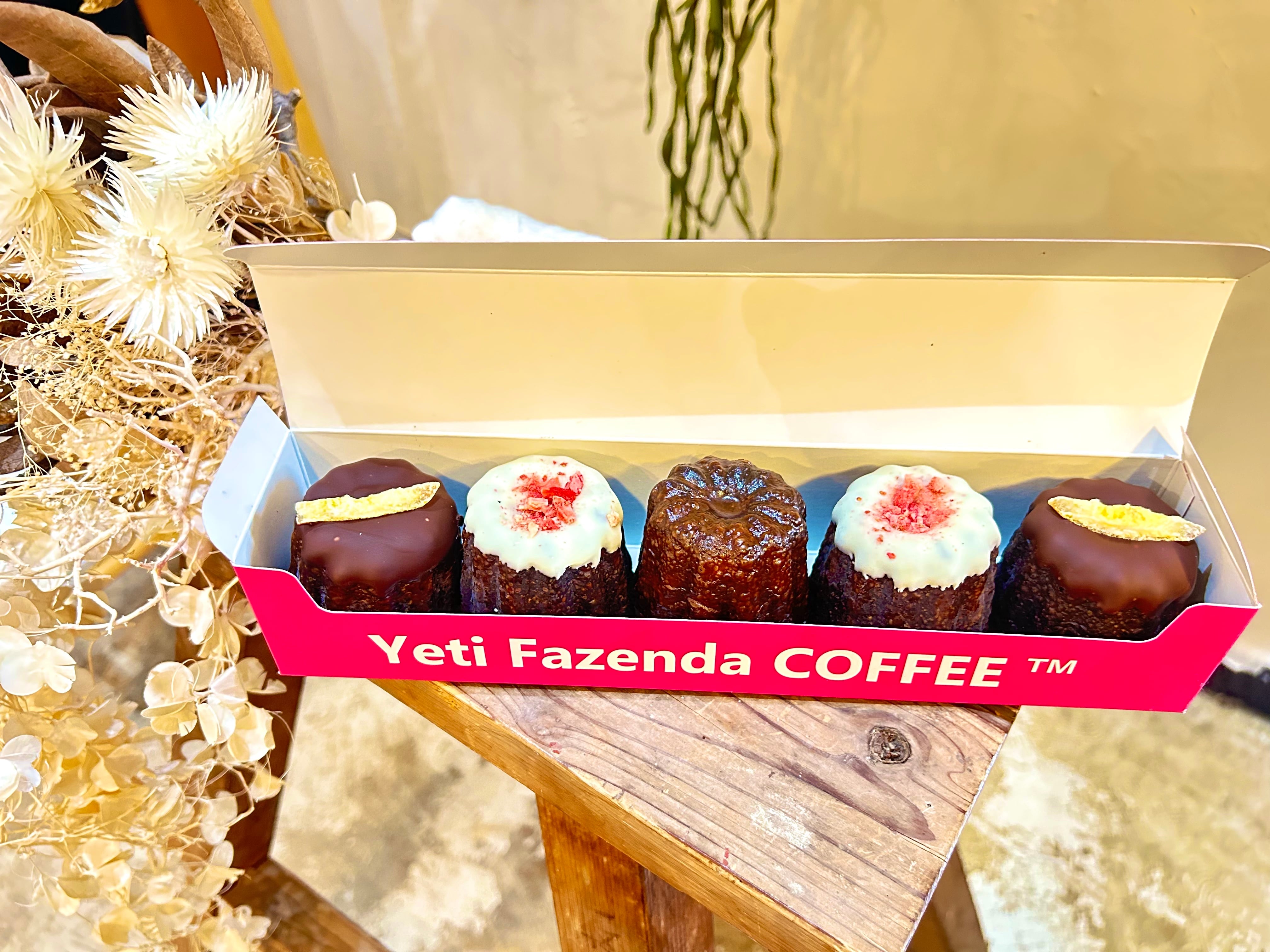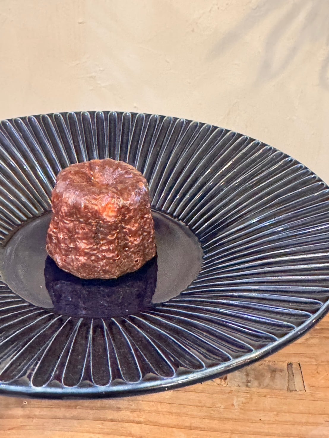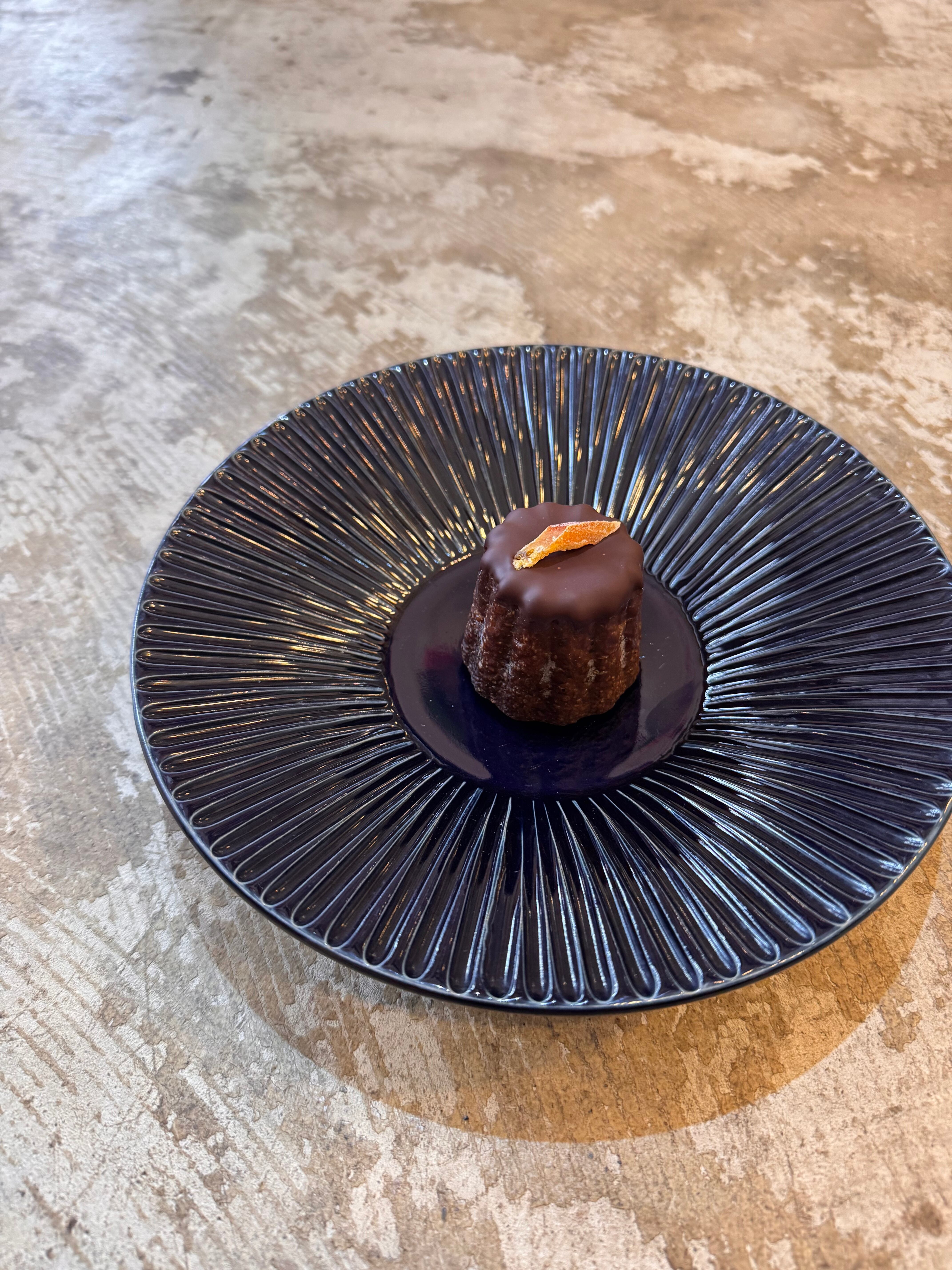 バニラ生地のカヌレにフランス産のチョコレートとオレンジをトッピング